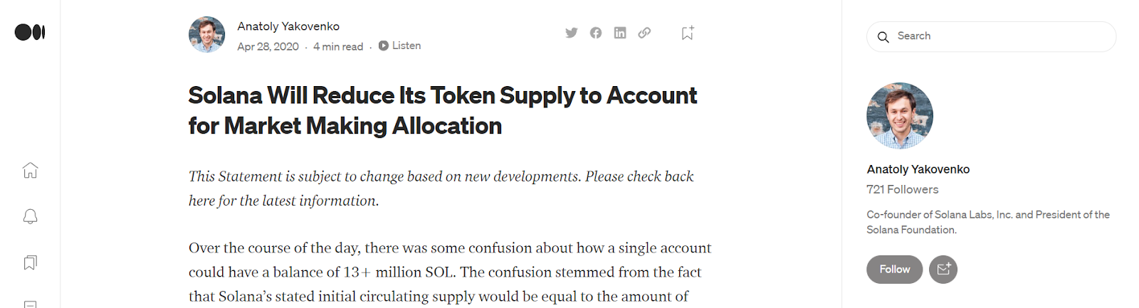 “In early April 2020, the $SOL team stated that the total circulating supply was 8.2M when in reality, the total circulating supply was above 20M.”