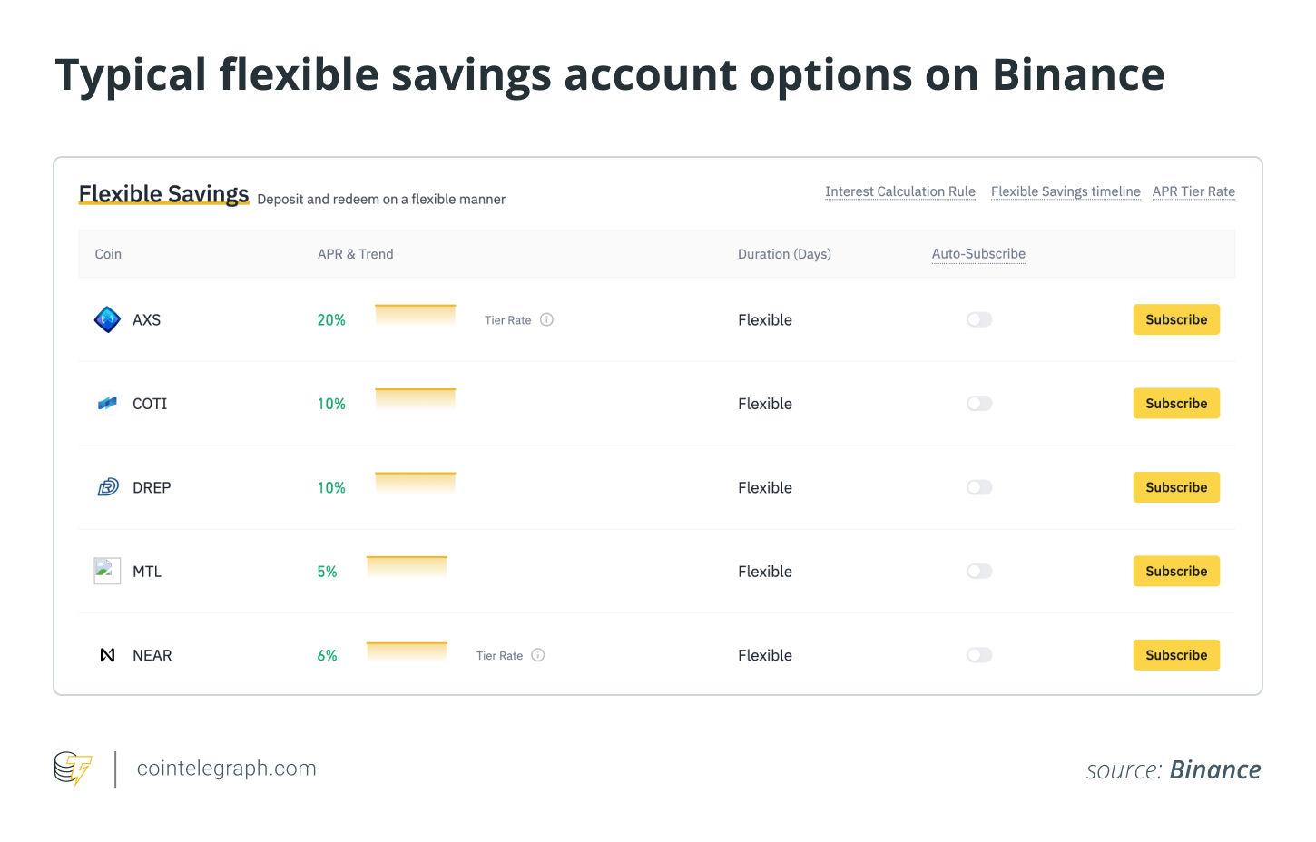 Binance is the other global popular crypto platform that offers interest rates on many cryptocurrencies with flexible savings and locked savings options: