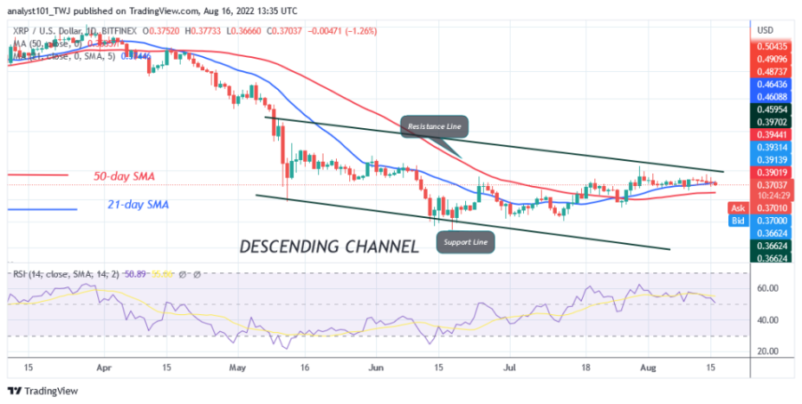 The price of Ripple (XRP) is trading in the uptrend zone as the altcoin drops below the 21-day line SMA. On August 14, buyers pushed XRP to the high of $0.39, but were rejected.