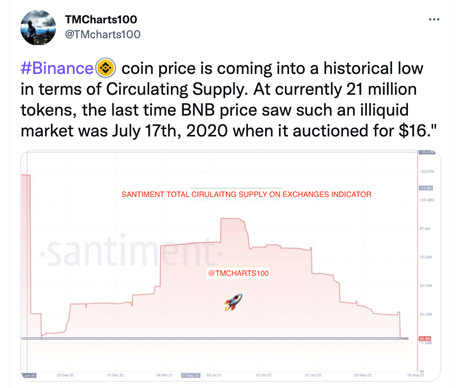 Binance Coin price shows a significant on-chain analysis that every knife-catcher hopes for. Fourteen million tokens have already been locked and burned this summer, drastically reducing Binance Coins' circulating supply back to just 21 million tokens. The last time 21 million tokens were in circulation, the Binance coin traded at $16 in July 2020. A year later, the BNB price rallied more than 4000% to a high of $643 on November 8, 2021.