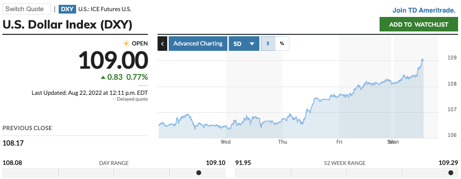 According to data by MarketWatch, in the past five-day period, DXY has gone from around 106.48 to 109, which isthe highest it has been since June 2002.