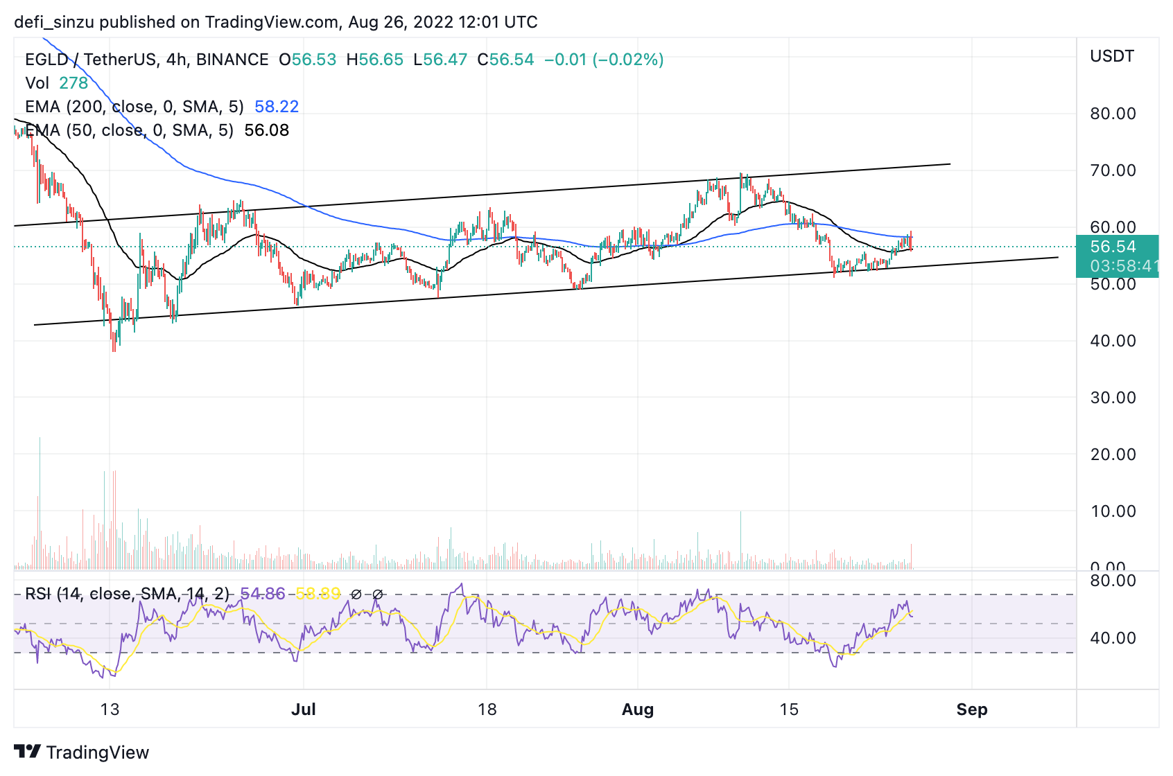 The price of EGLD has shown a little bullish trend below the 200 EMA price, which correspond to $58, acting as resistance to the EGLD price.