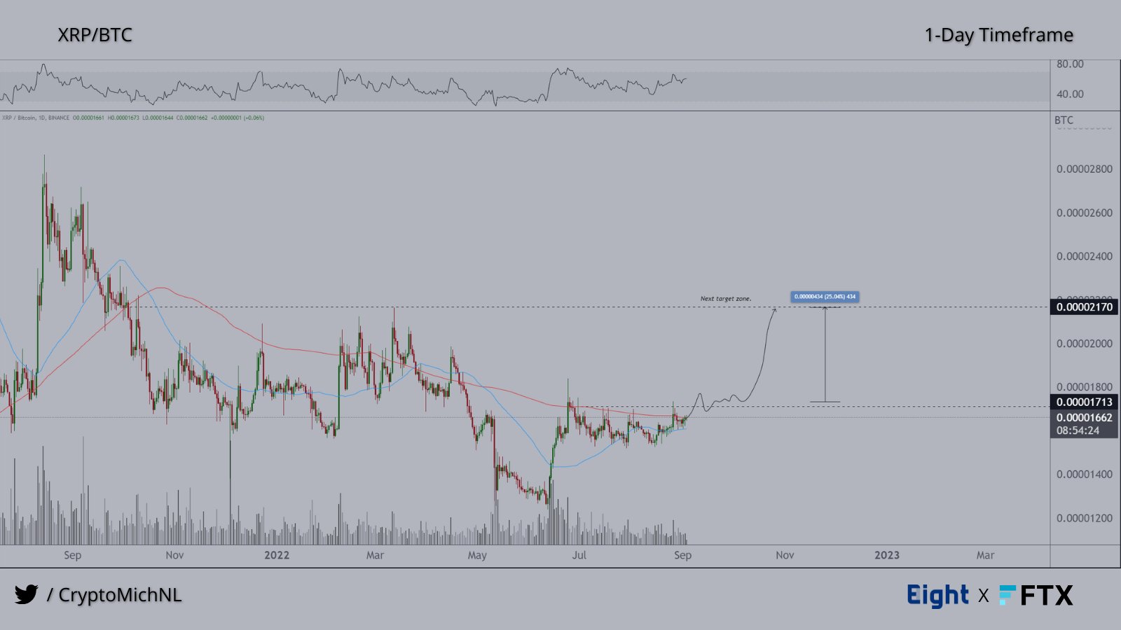 Next up is XRP, which Van de Poppe says looks ripe for a breakout against Bitcoin (XRP/BTC).