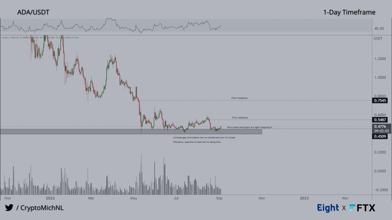 “Cardano has the hard fork coming up and has a beautiful retest of support, confirming a double bottom. Targets: $0.55 and $0.75.”