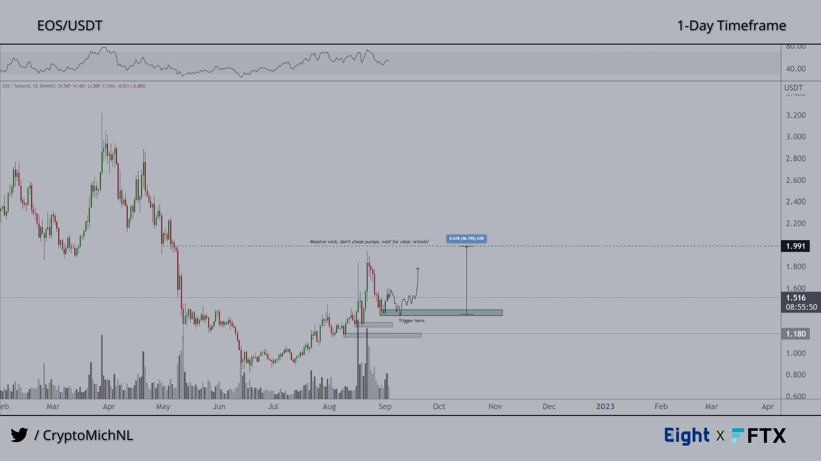 Another coin on the trader’s list is smart contract protocol EOS (EOS). According to Van de Poppe, EOS will likely revisit support at $1.35 before it can ignite the next leg up toward $2.