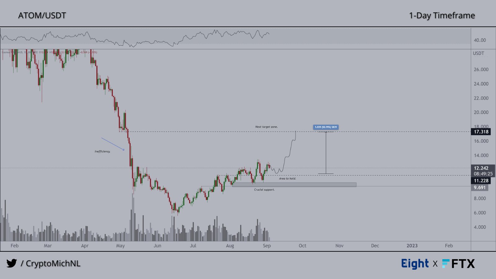 Last on the trader’s watchlist is Cosmos (ATOM), an ecosystem of blockchains designed to scale and communicate with each other. According to Van de Poppe, he’s bullish on ATOM as long as it trades above the key support area of $11.