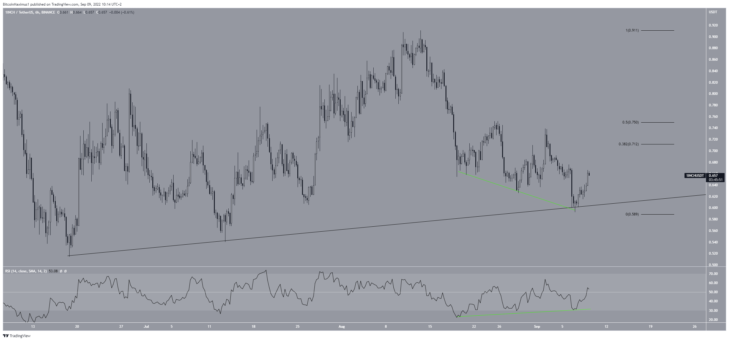 1INCH has been increasing alongside an ascending support line since June 18. The line has been validated numerous times, most recently on Sept 7.