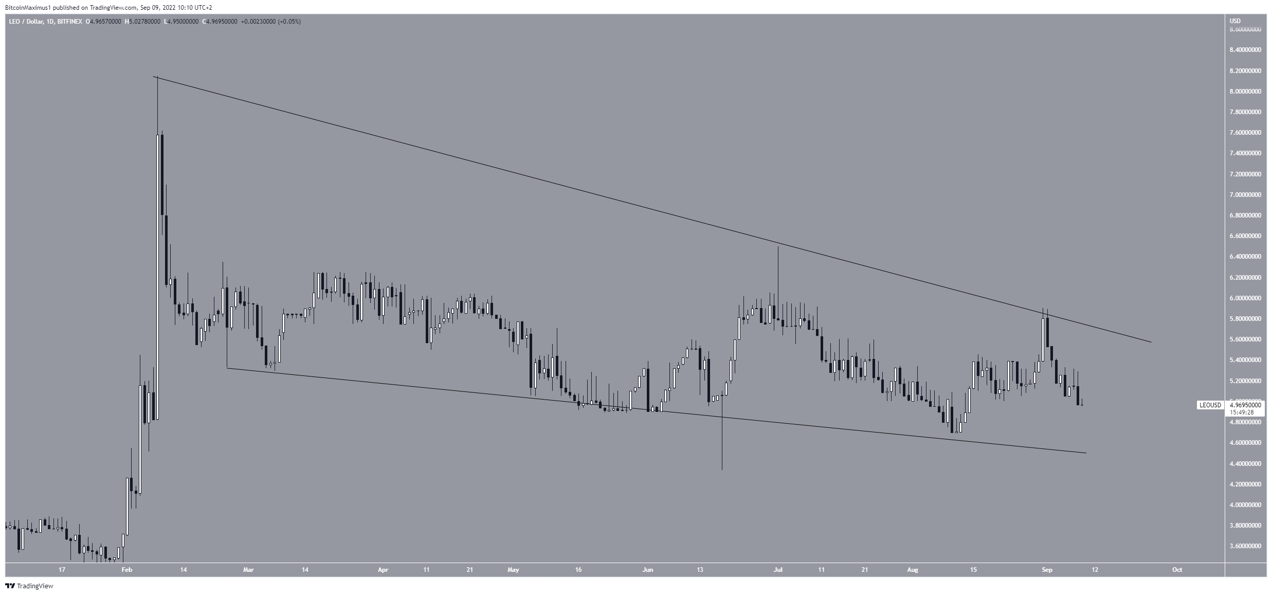 LEO has been decreasing inside a descending wedge since reaching a high of $8.14 on Feb 8. More recently, it was rejected by the resistance line of the wedge on Sept 1.