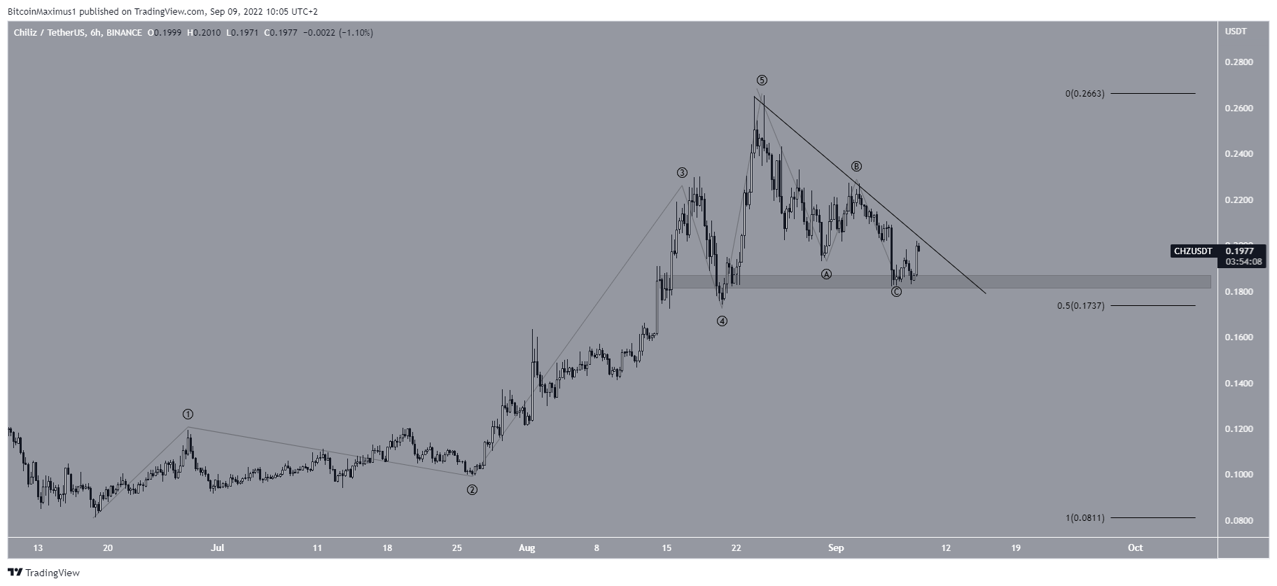 CHZ has been falling since reaching a high of $0.26 on Aug 24. The downward movement took it to a low of $0.182 on Sept 7. Afterward, the price bounced at the $0.185 horizontal support area.
