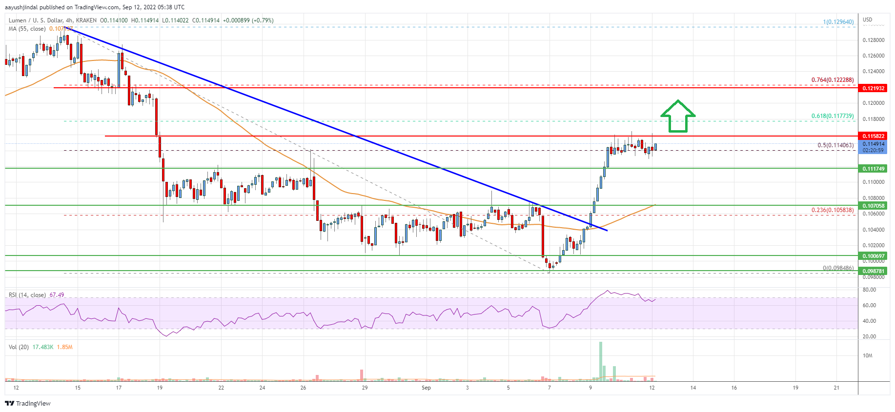 - XLM price is now trading above $0.1135 and the 55 simple moving average (4-hours).