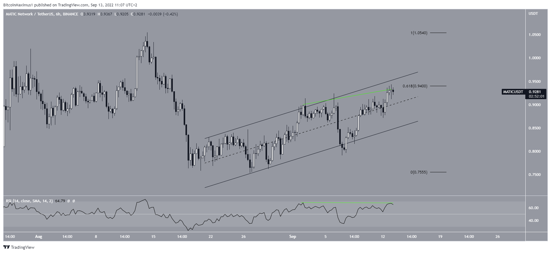 Finally, the six-hour chart shows that MATIC is trading inside an ascending parallel channel and is currently facing resistance from the 0.618 Fib retracement resistance level at $0.94.