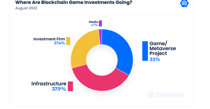 According to the analytics firm, games and metaverse projects receive about a third of the investments in the GameFi industry. The rest mostly goes to infrastructure and investment firms.