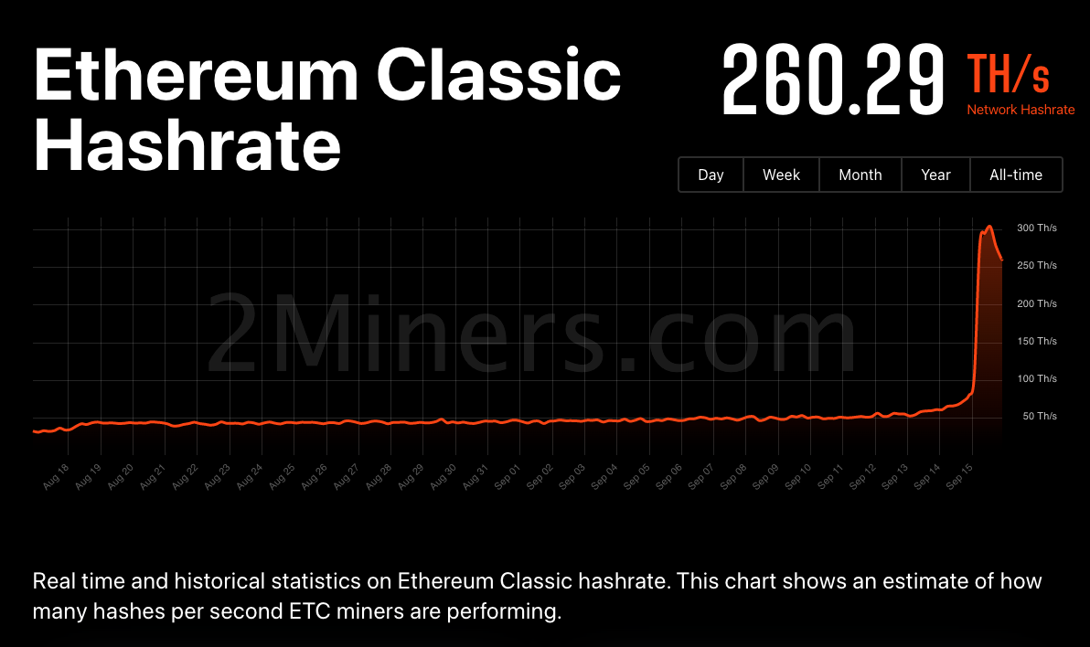 While they haven’t settled on any particular chain just yet, Ravencoin, Flux, Ethereum Classic and Ergo seem to be the frontrunners. Leading into the Merge, each network saw its hash rate rise to new all-time highs, as shown below.