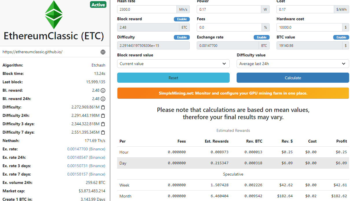 Our trusty GeForce GTX 1060 has a hashrate of 23Mh/s for Etchash, the algorithm used for Ethereum Classic.