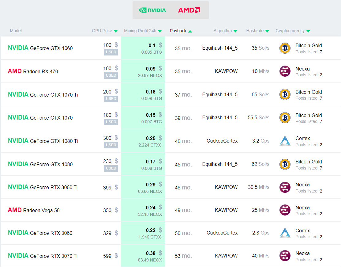 But the numbers aren’t going to work for miners looking to snap up some now-plentiful, used GPUs for mining. The best case scenario, using the GeForce GTX 1060, which goes on the second-hand market for $100, sees the card’s value being recovered in mined crypto in 35 months or almost three years.
