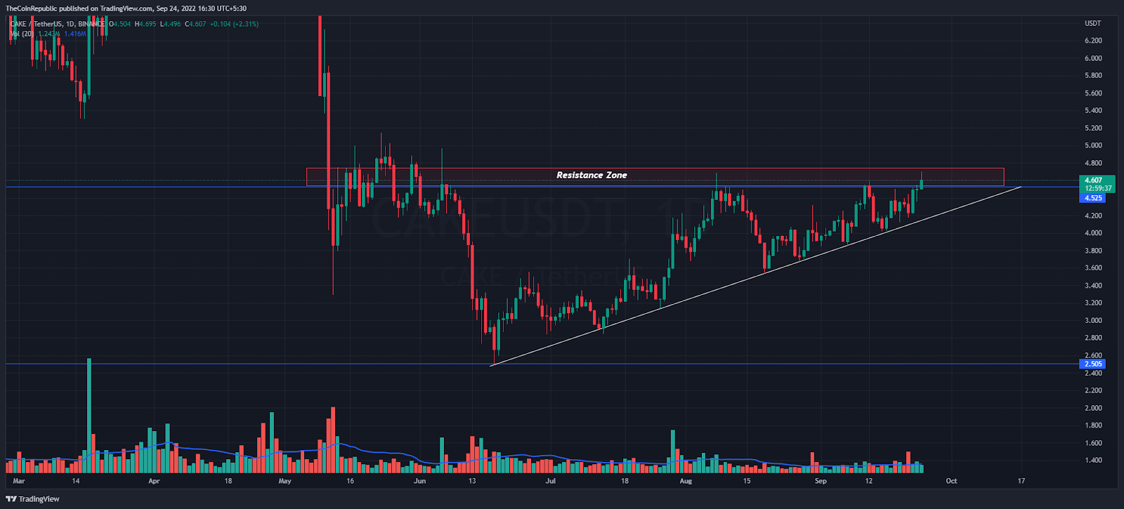Investors are celebrating an almost 80% rally in the last 100 trading sessions. This buying on the dip pattern could continue until buyers push the asset price towards the $10 conceptual round level, but this feat will take time. At the time, Cake price was inspecting a key resistance area of $4.5 to $4.8 (red box).