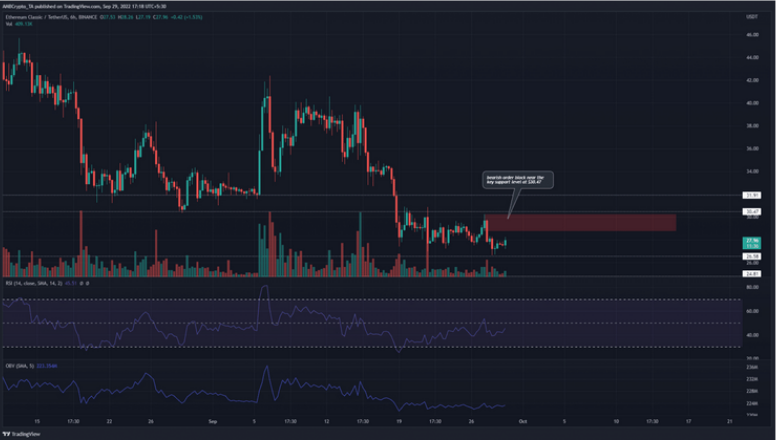 At this point, a bearish block is seen close to the $30 level. A climb by 8% will prove to invalidate the bearish outlook of ETC.