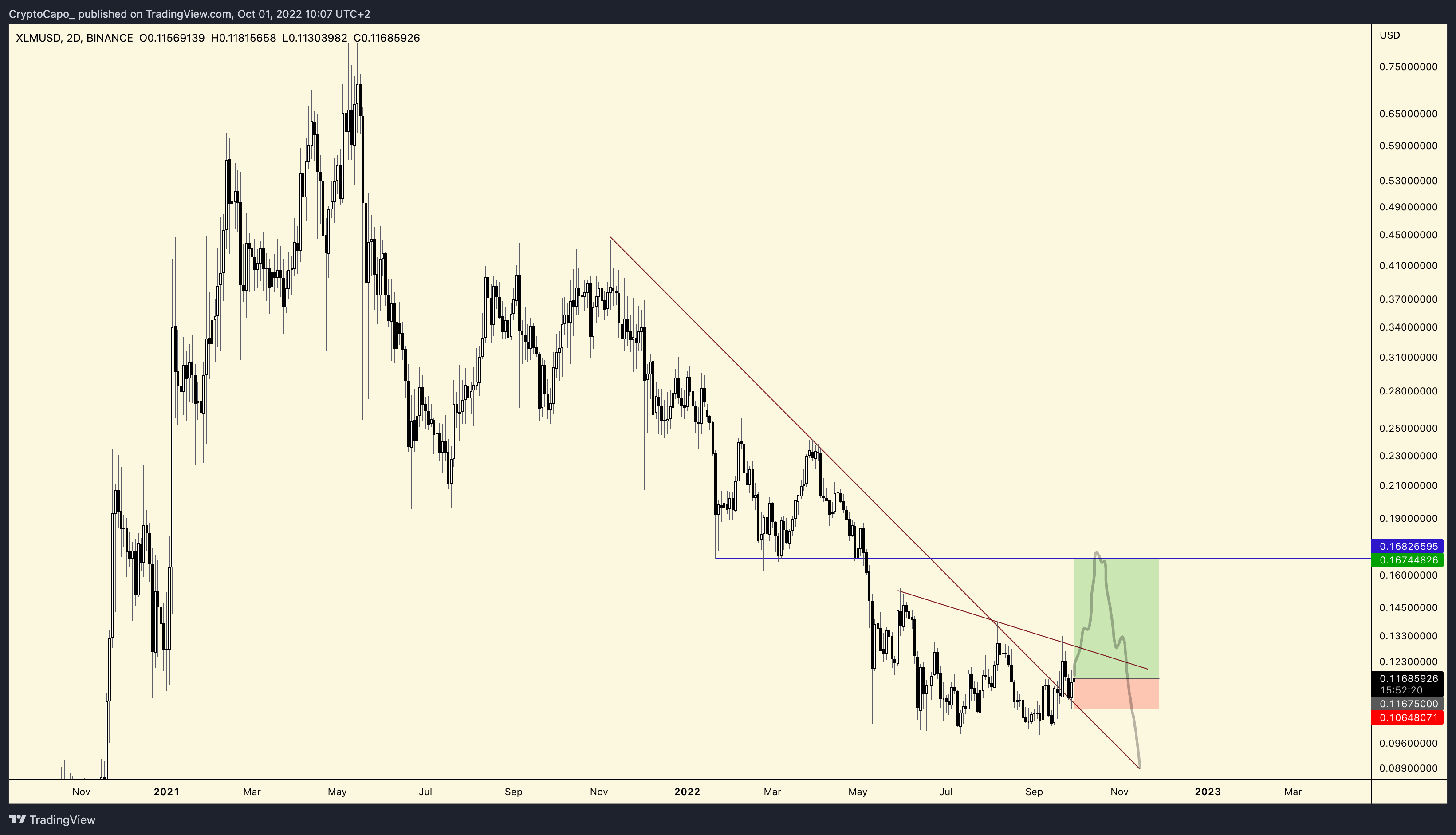 Another altcoin on the trader’s radar is Stellar Lumens (XLM), a crypto asset designed to act as a bridge between two fiat currencies when sending money abroad. According to Capo, XLM gearing up for a quick rally to his target of $0.16 before resuming its downtrend.