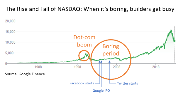 But! It was during this long, slow, boring period that today’s most powerful tech companies were launched: Google, Facebook, Twitter.