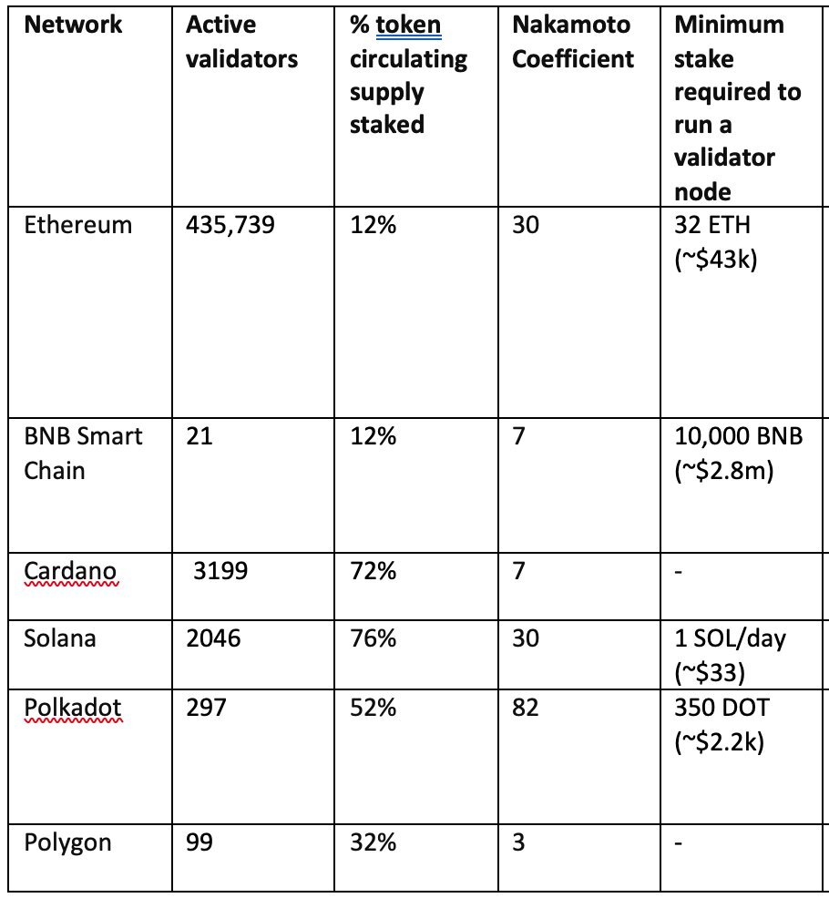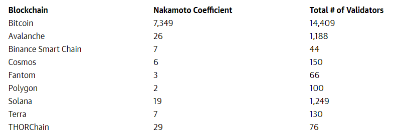 Such a high coefficient value is possible due to the relatively small number of validators combined with the relatively high security of the network. Among the largest blockchains, only Bitcoin (BTC) has a higher Nakamoto Coefficient, which is as high as 7,349.