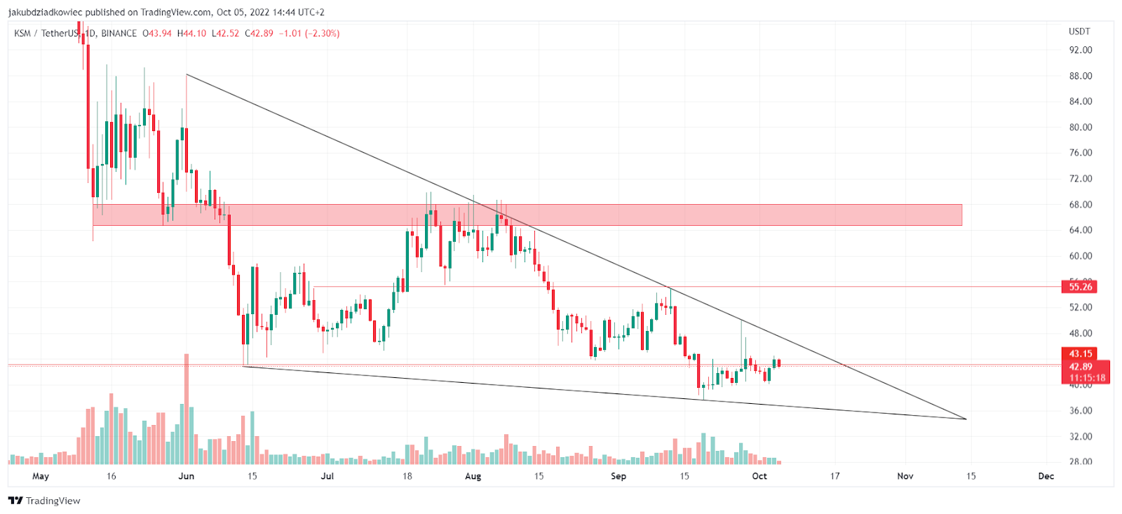 The price action of KSM, the token of the Kusama network, looks similar to the DOT chart. The difference, however, is that here the price has already fallen below the long-term support at $43.15. Moreover, the price is moving in a descending wedge pattern.