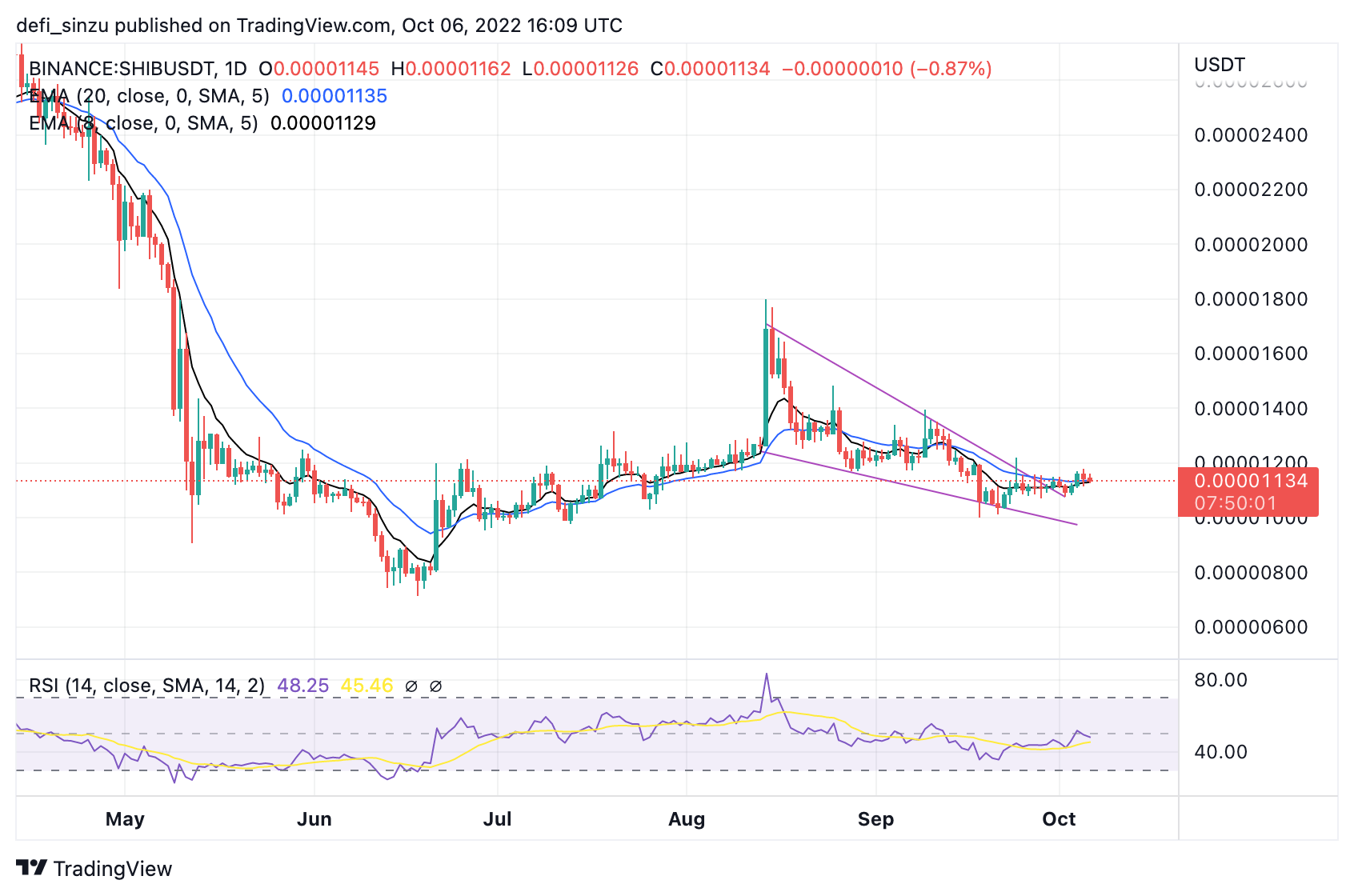 The price of SHIB currently trades at $0.00001134, just above the 8 and 20-day Exponential Moving Average (EMA). The price at $0.000011 corresponds to the price at 8 and 20-day EMA for SHIB on the daily timeframe.