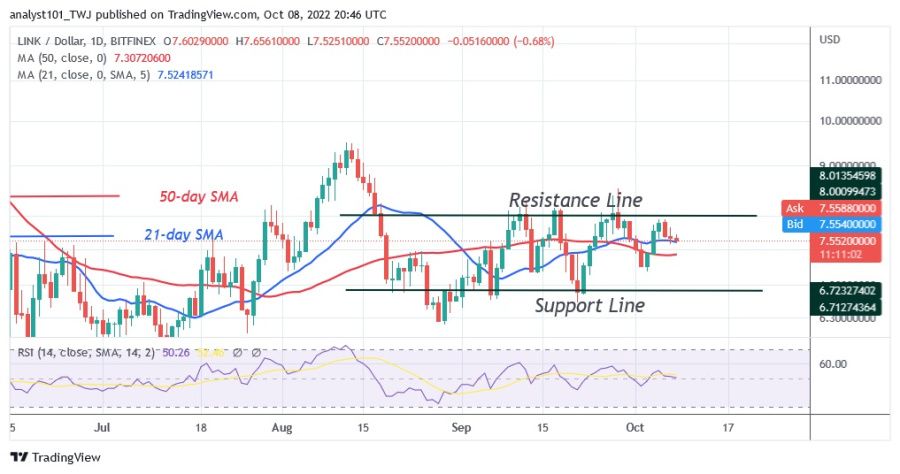 The price of Chainlink (LINK) is on the retreat downwards after reaching the resistance at $8.00.