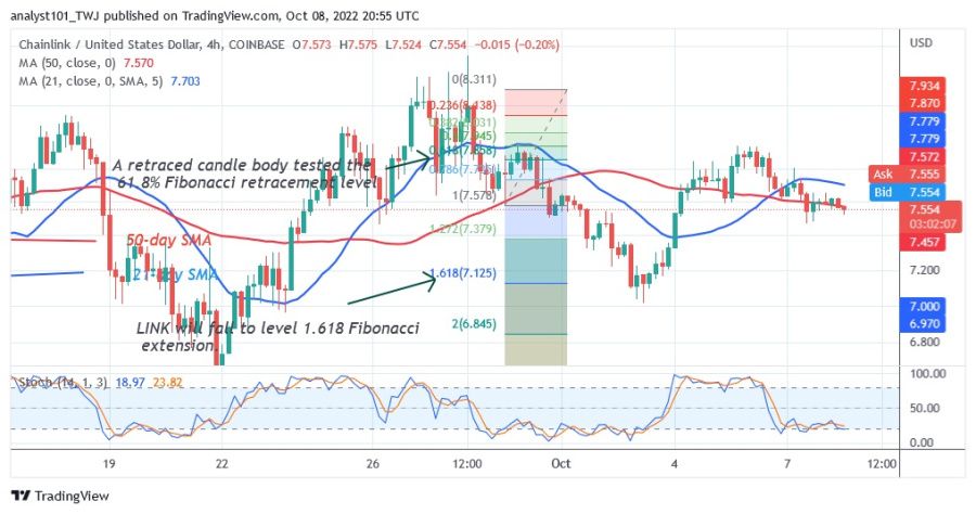 Chainlink has continued to decline after its rejection of the $8.00 resistance zone. The decline will accelerate if the price falls below the moving average. On September 29, LINK made an upward correction and a candlestick tested the 61.8% Fibonacci retracement level. The correction suggests that LINK will fall to the Fibonacci extension level of $1.618 or $7.12.