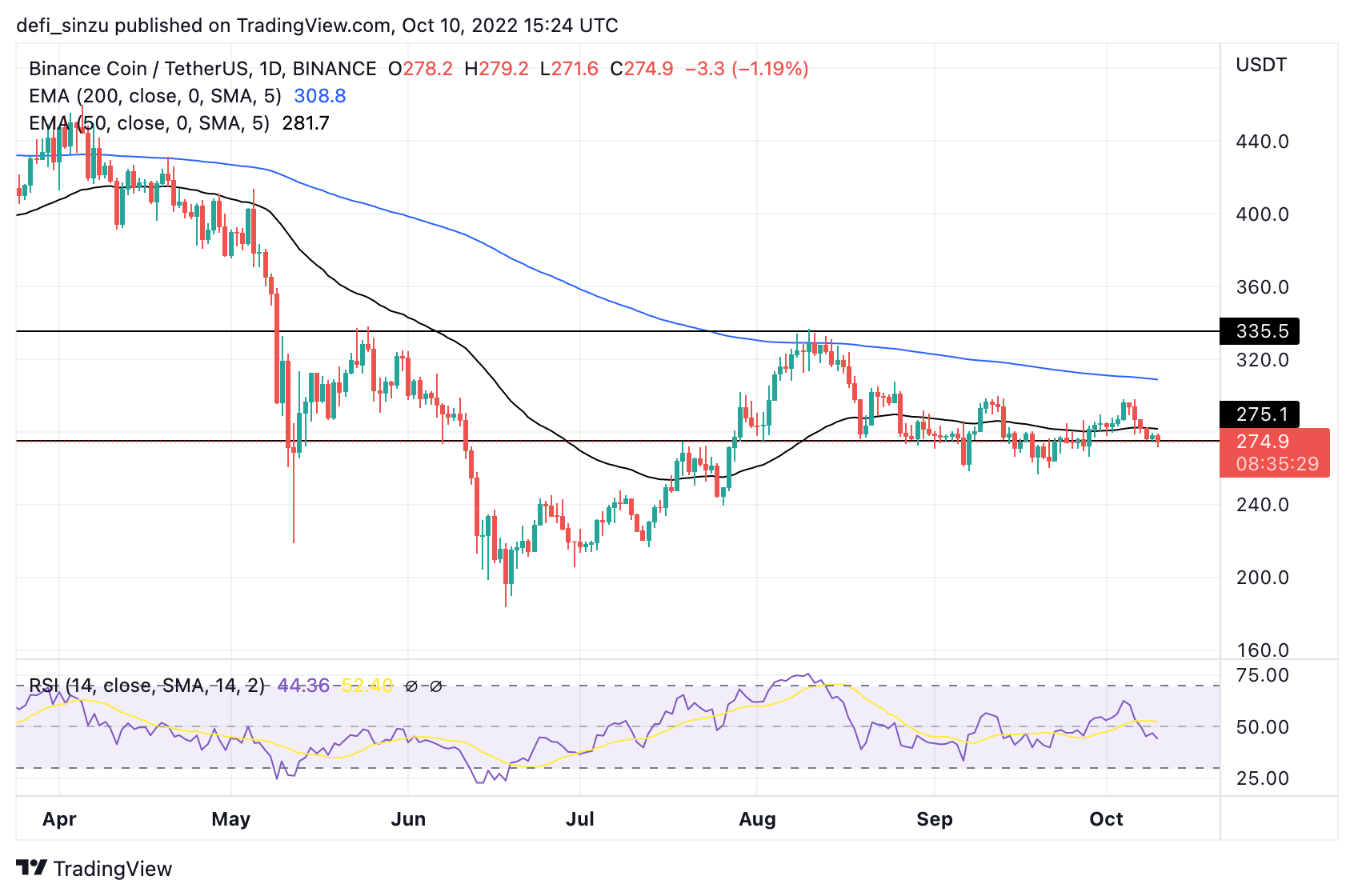 The price of BNB was rejected from its resistance of $290 and is currently trading at $280.