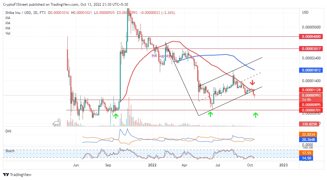 Now, Shiba Inu price is trading marginally below the bear flag pattern – a move likely to stretch its down leg to short-term support at $0.000008960 or further downhill to $0.000007000.