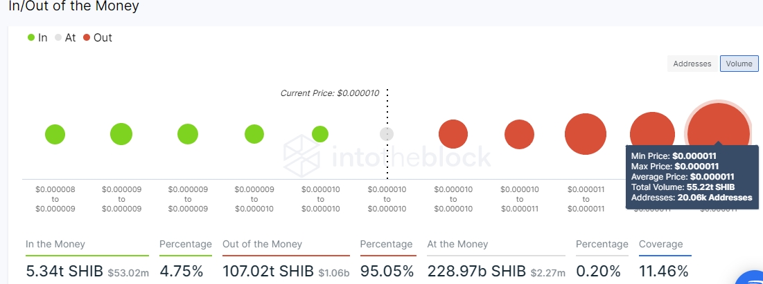 IntoTheBlock's IOMAP (In/Out of the Money) paints a grim picture for SHIB. If bulls flip the tables and push for an immediate rebound, a solid supply region at $0.000011000 may prevent them from achieving their desired potential.