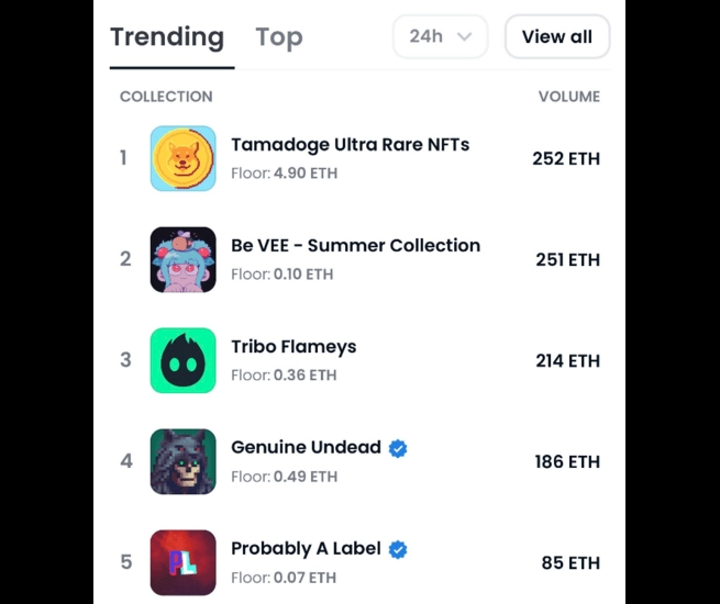 The first 100 Tamadoge NFTs went on sale on OpenSea and became the top trending collection on the site after seeing 258ETH worth of sales.
