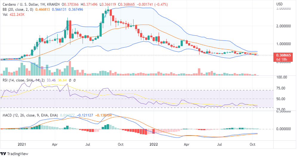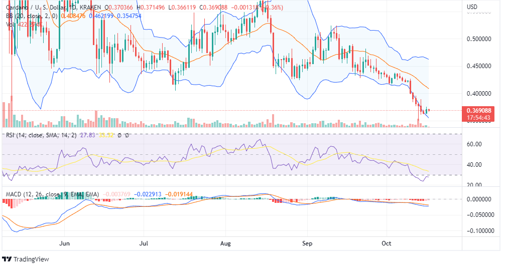 At the time of writing this post, ADA was trading around $0.36, which is below the previous support of $0.42. The candlesticks are forming around the lower Bollinger Bands with bearish MACD and RSI. Moreover, RSI is in the oversold zone, which suggests extreme bearishness for the short term.