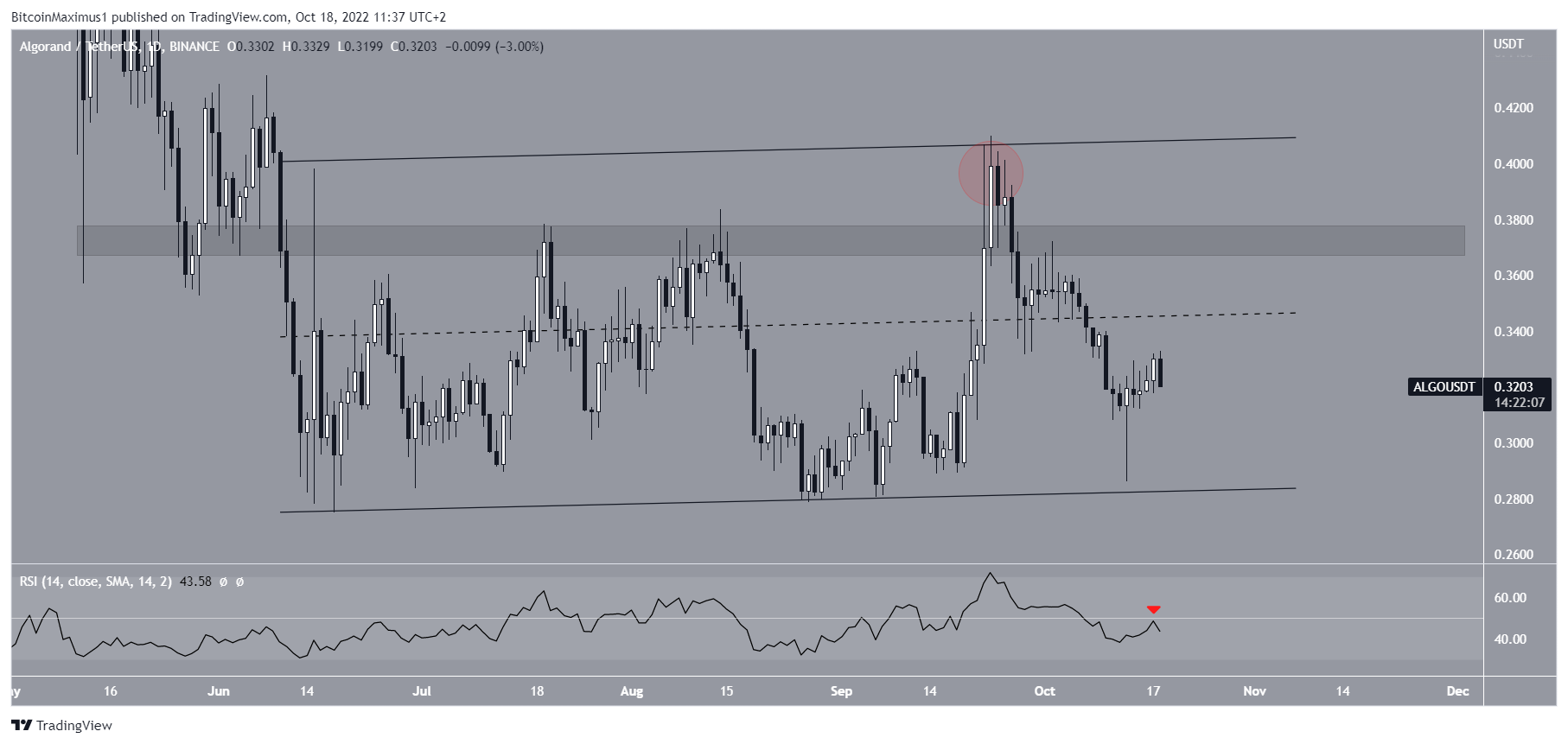 ALGO has been increasing inside an ascending parallel channel since falling to a yearly low of $0.275 on June 18. ALGO price made a breakout attempt on Sept. 23 but was rejected by the resistance line of the channel (red circle).