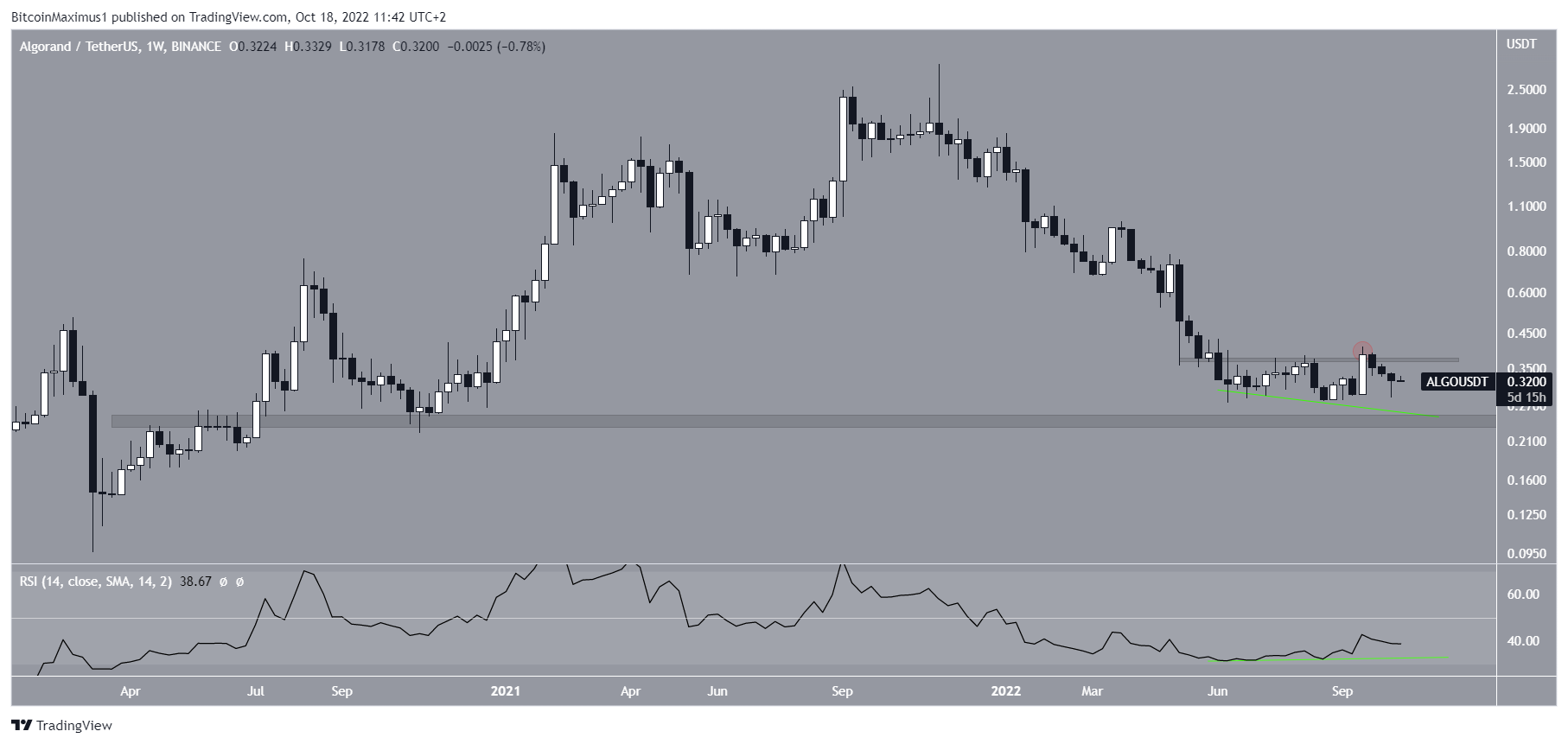 If the ALGO price fall to $0.24, it would potentially create the third touch of bullish divergence (green line) in the weekly RSI. This would confirm the divergence. Also, it could confirm the long-term bullish reversal.