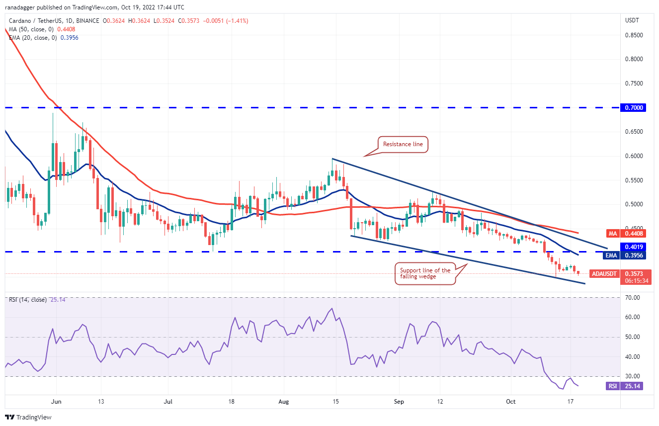 If bulls want to avert a collapse, they will have to quickly push the price above the 20-day EMA ($0.39). The pair could then rise to the resistance line of the wedge. A break above this level could point to a potential trend change.