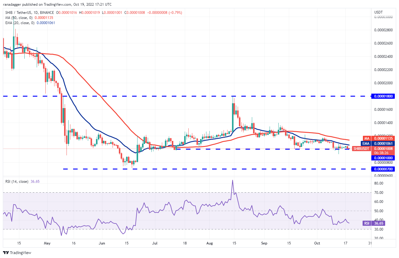 Shiba Inu’s (SHIB) recovery fizzled out near the 20-day EMA ($0.000011) and the price has declined to the strong support at $0.000010.