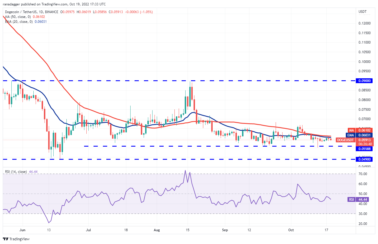 Dogecoin (DOGE) pierced the 20-day EMA ($0.06) on Oct. 18 but met with stiff opposition at the 50-day SMA ($0.06). This suggests that the sentiment remains negative and traders are selling on minor rallies.
