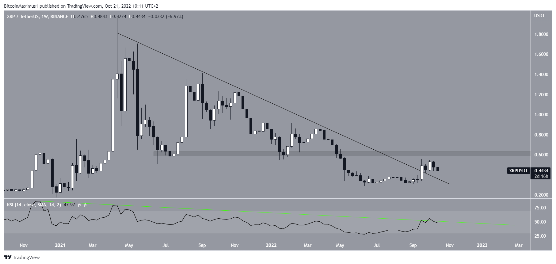 The most bullish scenario would be a weekly close above the $0.60 resistance area and a decisive RSI breakout above 50. The $0.60 area is crucial since it previously provided support since the beginning of 2021. It has yet to be validated as resistance.