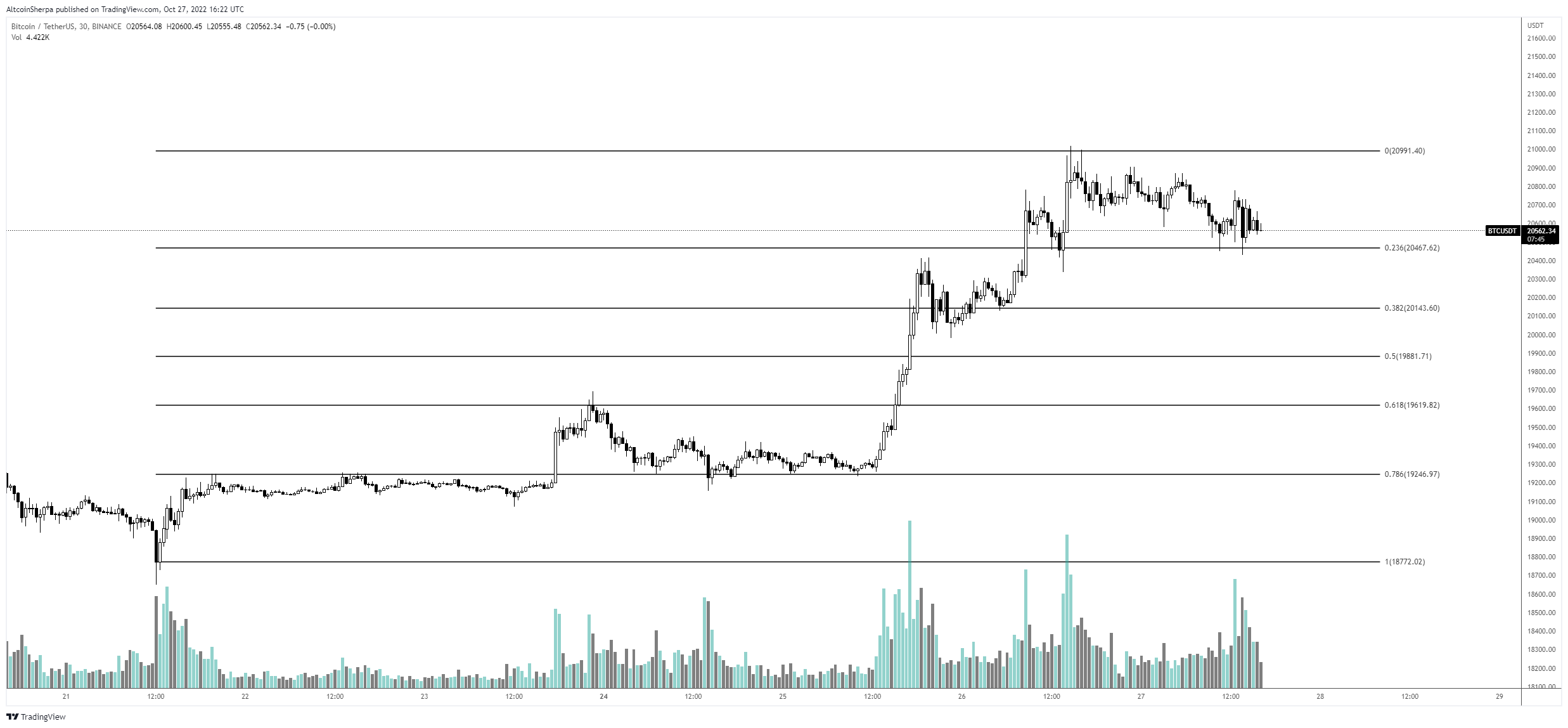 “BTC: Wouldn’t want to see the $21,000 area get lost personally. I’m not even sure if this [Fibonacci chart] is well charted to be honest, might rather go from the impulse.”