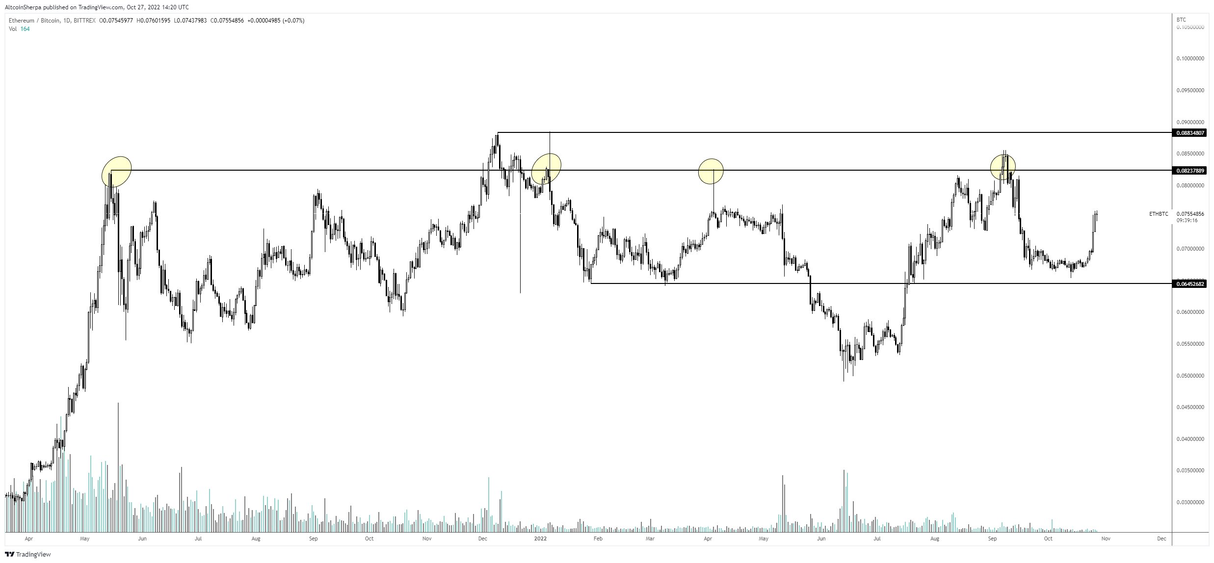 “ETH/BTC is usually a decent indicator for the entire altcoin market as a whole and it still looks pretty good. Expecting this to grind up to the .0823 area in the mid-term.”