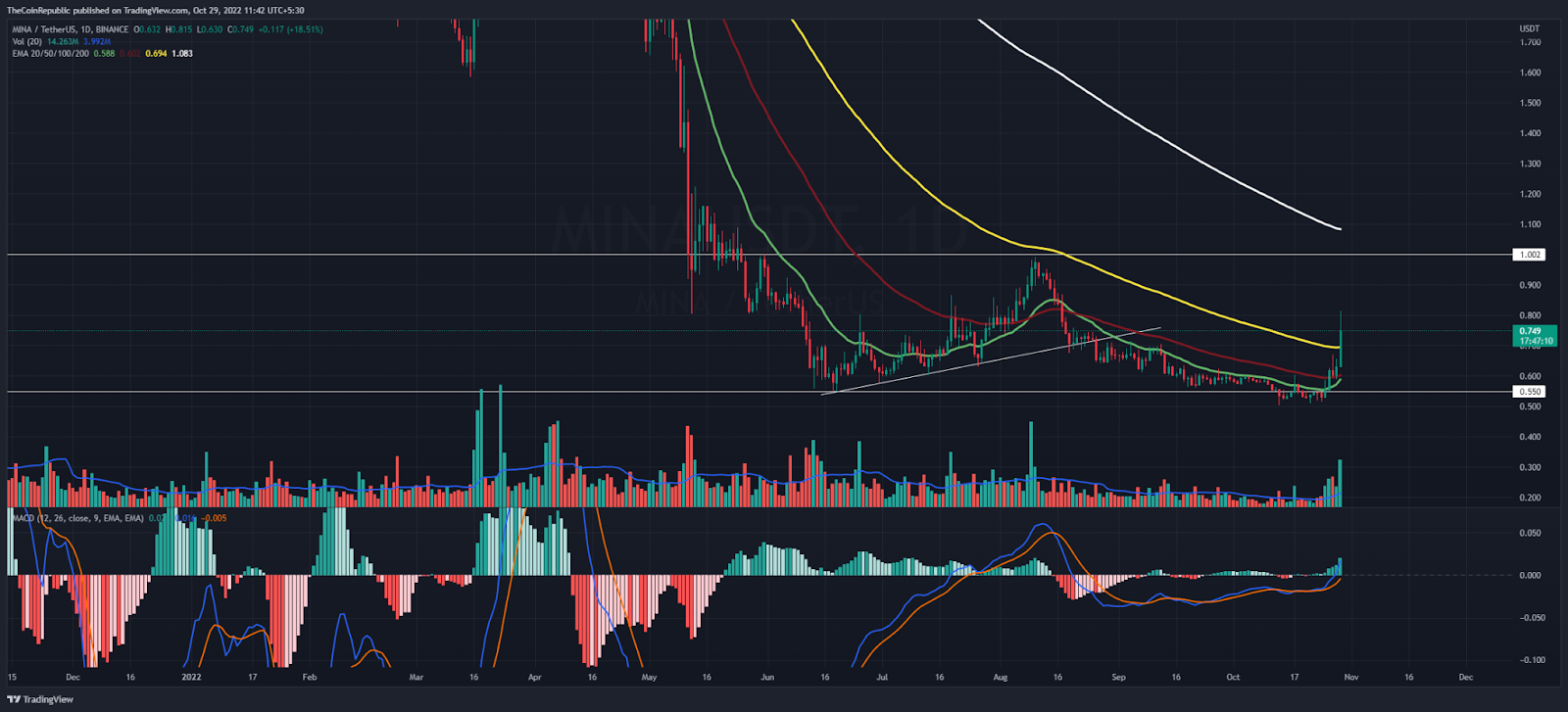 As of press time, MINA coin is trading at the $0.76 mark against the USDT pair and is also making a 20% intraday gain. Traders have never seen this gain in the digital asset in the past 60 days, which means that the bulls are now on the offensive. Thus the market cap now reached $549.6 million and increased by almost t28% in the last 24 hours.