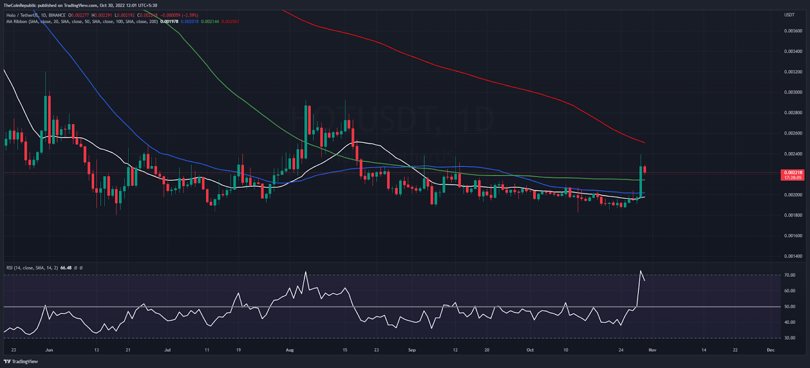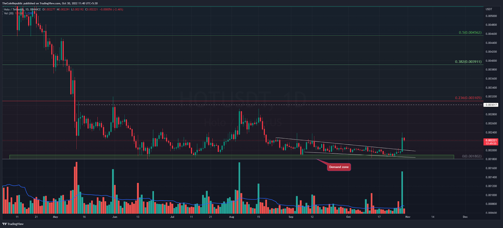 Amid retracement stage, HOT token against the USDT pair is trading at $0.002209 mark together with 3% intraday drop. Despite the fact, the market cap of HOLO crypto reclaimed 11.8% in the last 24 hours at $385.6 Million.