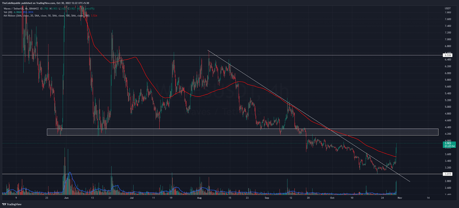 Against the USDT pair, Waves coin is trading at $3.85 mark at the time of writing. The price action makes higher-lows for the last three days. As a result, market cap reported at $442.49 market today together with 15.3% gain overnight. In addition, Trading volume increased by 472% in the last 24 hours recorded at $411.2 million.