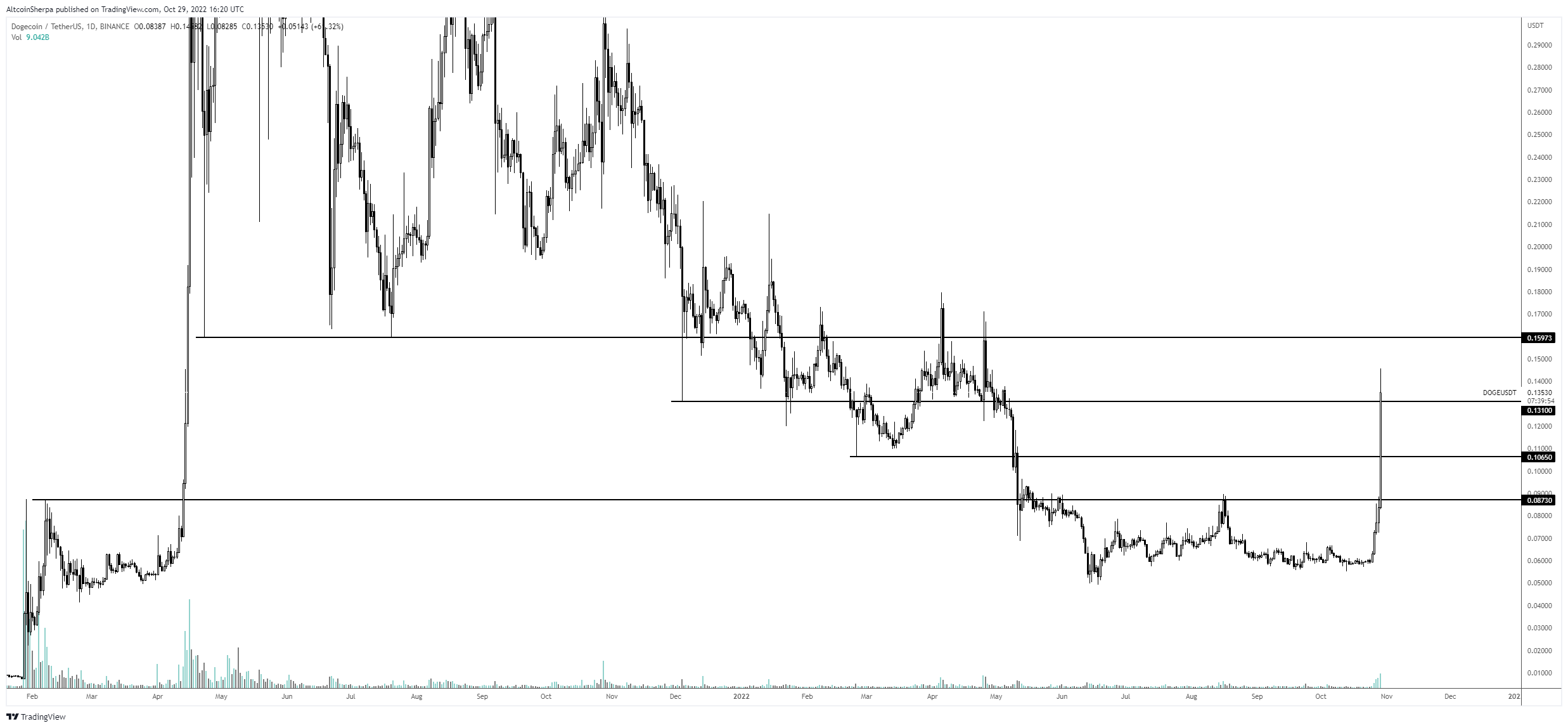 At time of writing, Dogecoin is swapping hands for $0.138, up over 63% in the last 24 hours.