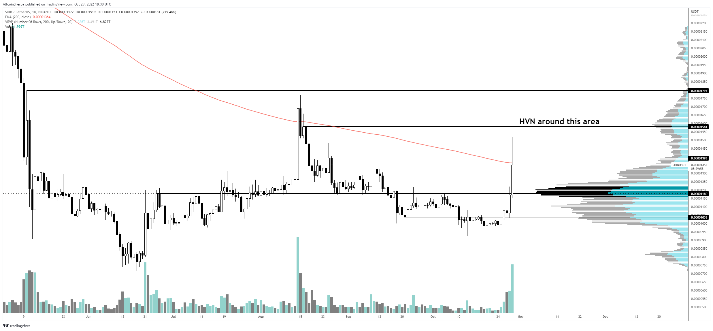 “SHIB: Lagging to DOGE right now. This current 200-day exponential moving average is acting as resistance and price is pulling back. I’d like to see acceptance above $0.00014 before calling for higher [prices].”