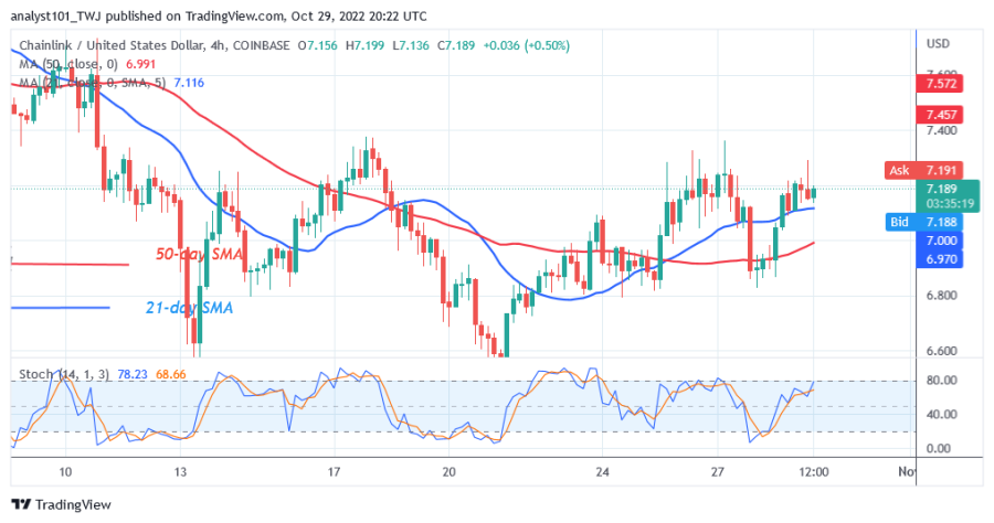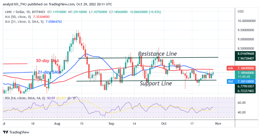Chainlink is in a sideways movement as it is contained between the price levels of $6.60 and $8.00. The upward correction threatens to fail at the 50-day line SMA. In the meantime, the cryptocurrency price is fluctuating between the moving average lines.