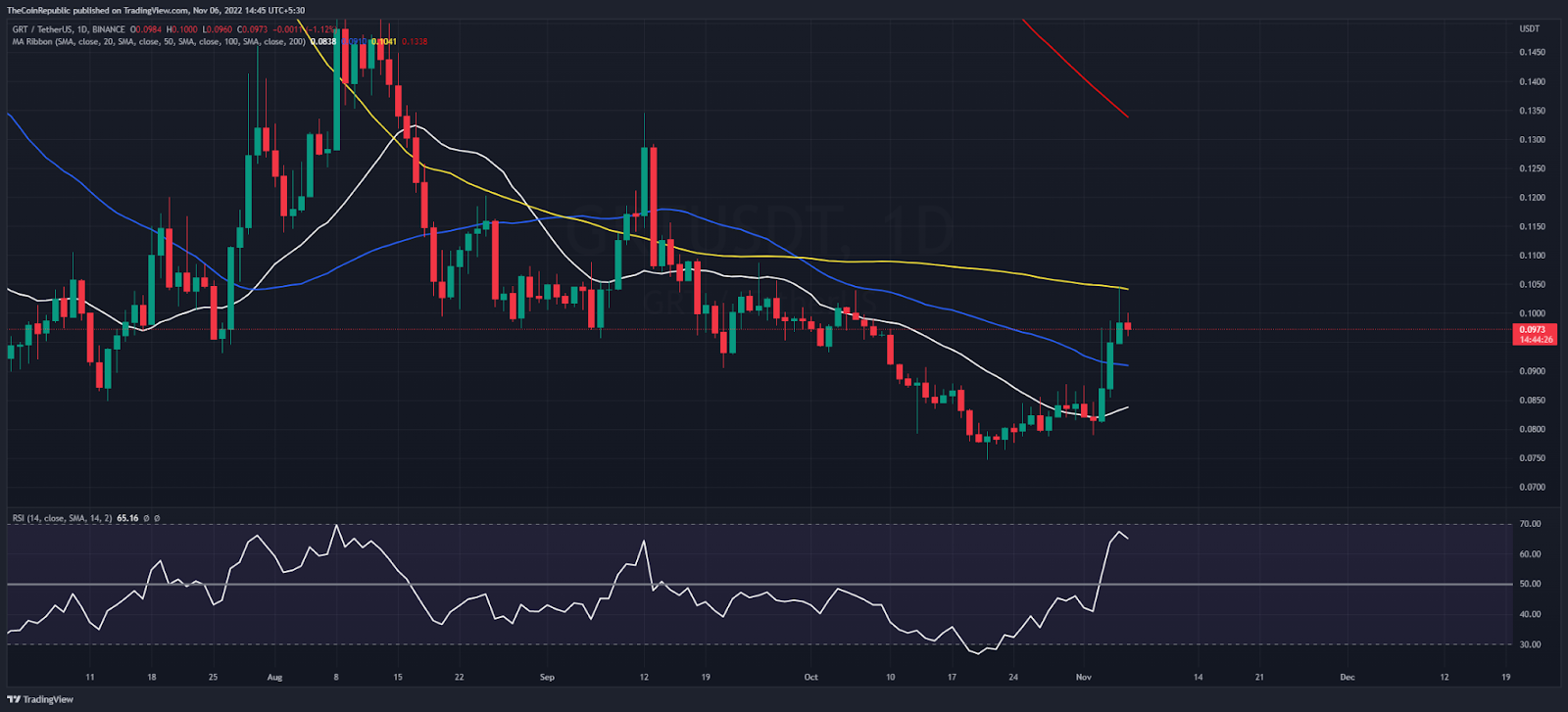 The Graph Price has reversed its previous price trend. On the hourly price chart, price action is forming a high-low formation since its 60-day low. At the time of writing, The GRT token of the USDT pair is trading at $0.096. In the intraday trading session, the bears are accumulating the price of the crypto to the downside.
