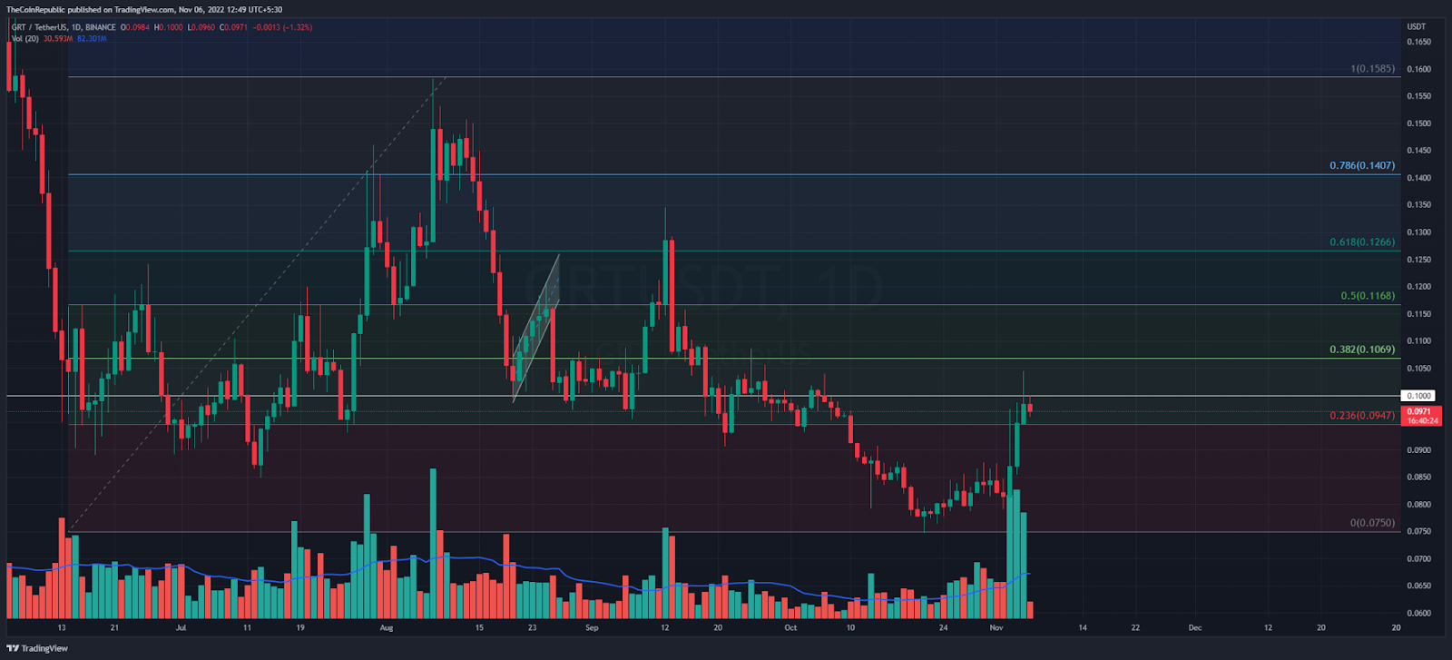 Although, price action is drawing the higher-lows forming on daily and weekly charts. As of now, GRT stays above the 0.236 level of fib retracement. Above conceptual round level of $0.10, buyers may propel digital asset price until 0.618 level of fib retracement. The GRT token has multiple resistance levels.