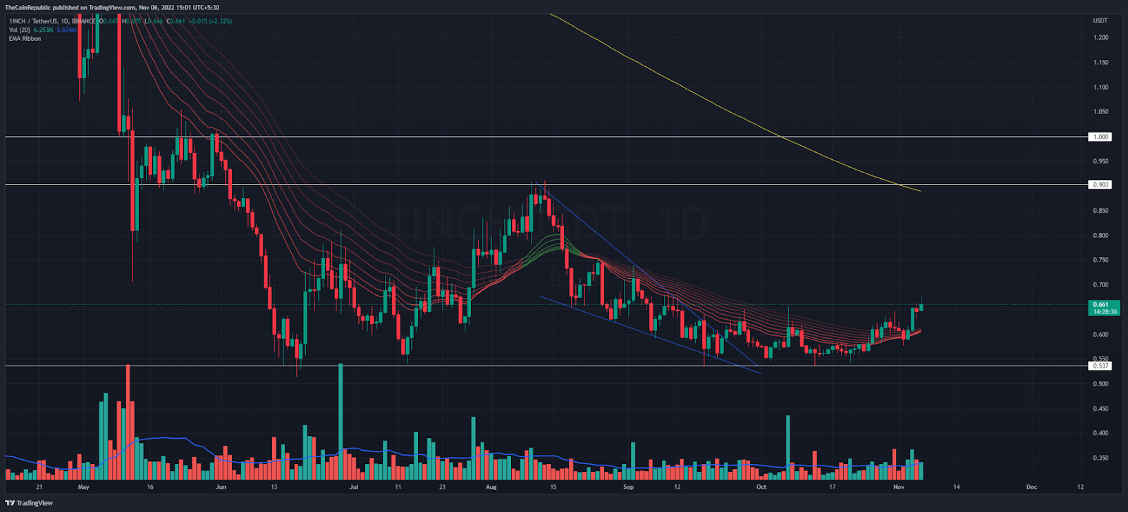 Undoubtedly, the price of 1 Inch Network has reversed several times from the $0.537 level. This 52-week low is a key hedge area for the bulls and buyers may turn the trend aggressively in the upcoming trading sessions. However, crypto has fluctuated across a wider trading range over the past five months. In fact, the conceptual round level $1.0 is an expensive figure for the bulls.